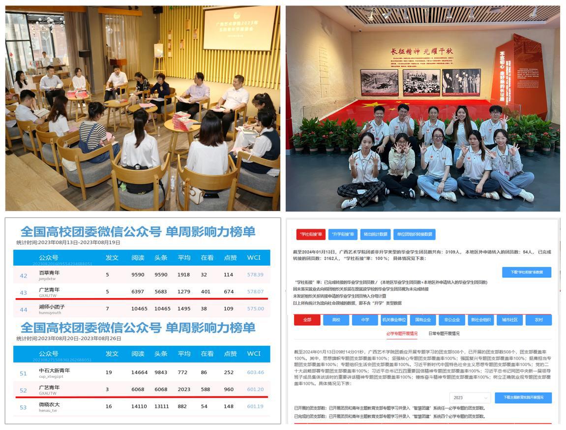 聚焦育人主业,筑牢思想根基,提升思想政治引领实效。校团委以面向广大团员和青年开展学习贯彻习近平新时代中国特色社会主义思想主题教育为统领,推动团员和青年主题教育各项安排有力有序落深落实。深入开展“书记、校长开学第一课”、五四青年座谈会、学生干部培训、“青马工程”、主题团课等活动,全校515个团支部覆盖率达100%;“广艺青年”官微全年总浏览量达30w+,综合影响力名列前茅,十余次登上全国高校团委微信公众号影响力榜单。