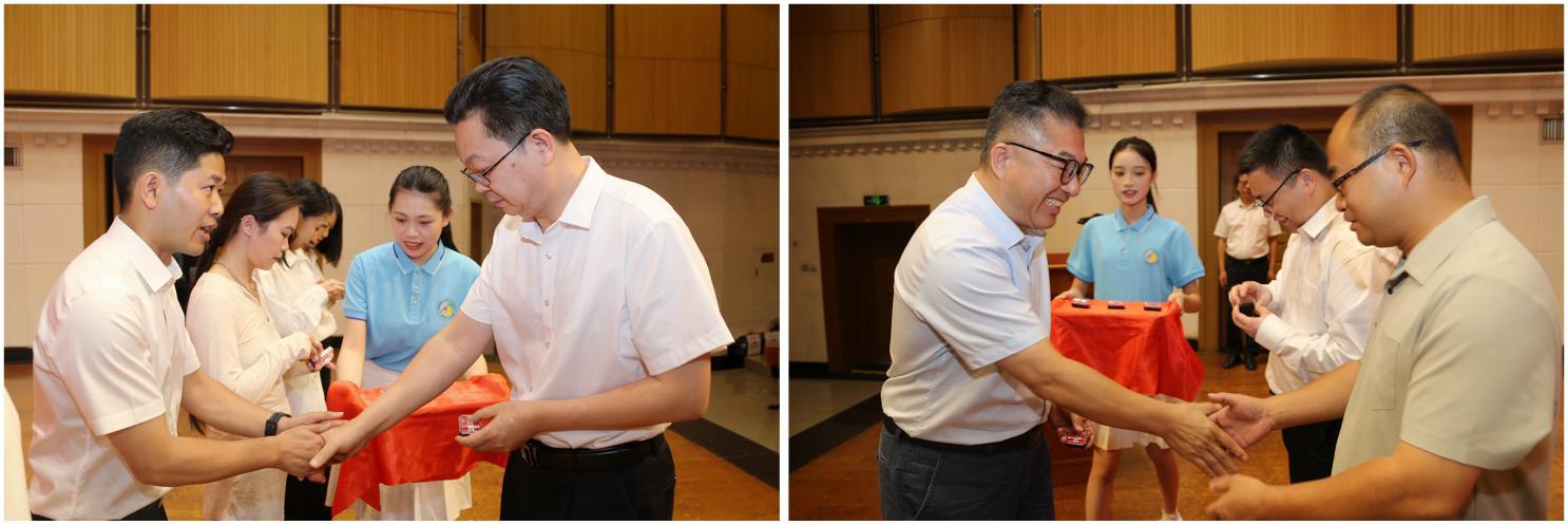 大会举行了新聘教职工入职宣誓仪式。学校领导刘伯贤、韦俊平为新入职的教职工颁发校徽。新聘教职工面对国旗庄严宣誓。