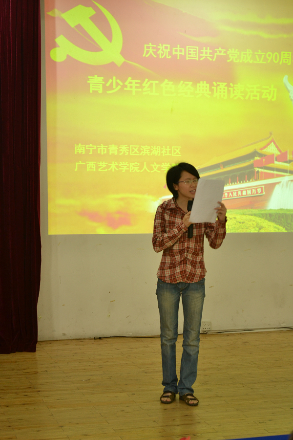 2011年4月16日上午,人文学院学生党支部与结对共建单位南宁市青秀区滨湖社区党委的党员代表们相聚在我院学术报告厅,举行了庆祝中国共产党成立90周年的系列活动之——“青少年红色经典诵读”活动。青秀区滨湖社区党委书记黄志英,党委副书记、副主任李菊,社区居委会副主任李锦鸿,人文学院学生第二学生党支部书记郭文慧老师及社区青少年代表参加了本次活动。